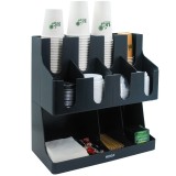 Универсальный органайзер для кофейной зоны имеет четыре отделения размерами 10x10 см., глубиной 22 см. для стаканов, и четыре отделения 10x10 см., глубиной 9 см. для крышек в верхней части, а также три отделения в нижней части для салфеток, мешалок, чайных пакетиков, сливок и прочих порционных продуктов со следующими размерами: два отделения 9,5x20,5 глубиной 3,5 см. и одно отделение размерами 20x20,5 см. глубиной 3,5 см.