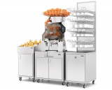 Профессиональная подиумная соковыжималка с загрузочным бункером на 20 кг. апельсинов, скоростью отжима 40 апельсинов в минуту, с легкосъемной системой отжима 1Step Kit, управляемая двухпозиционным дозатором 2Services tap с держателем для бутылок, с автоматической системой очистки фильтра PulpOut, с системой отвода воды из бункера, накопительным счетчиком отжатых плодов и программатором, с широким подиумом из нержавеющей стали.